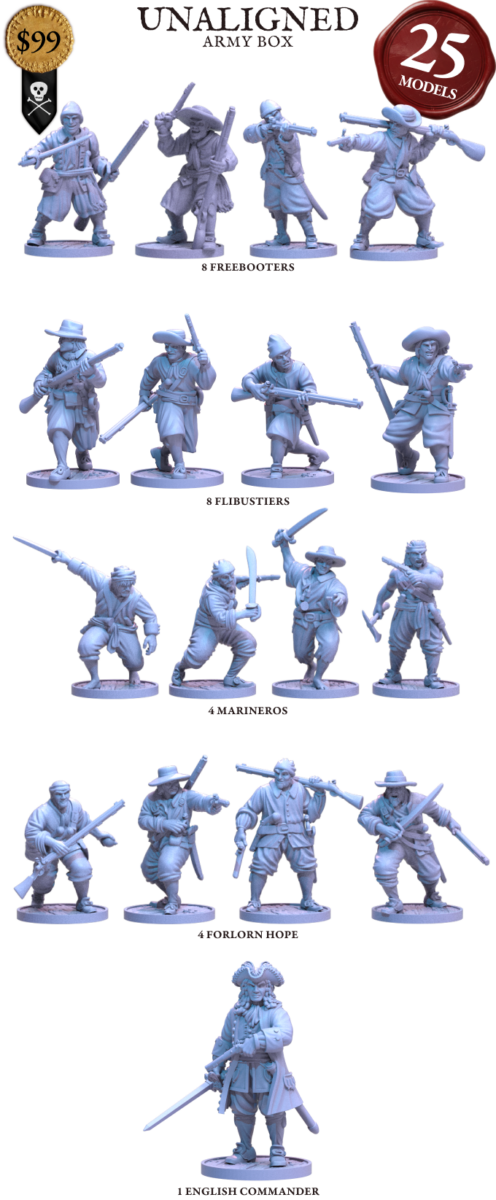 However, I would recommend the Unaligned Box if Port Royal is your main game. This is because you get a mix of some of the new Spanish, French and English sculpts, which gives you greater variety and allows you to field some more flavorful Characters in your Port Royal campaigns.